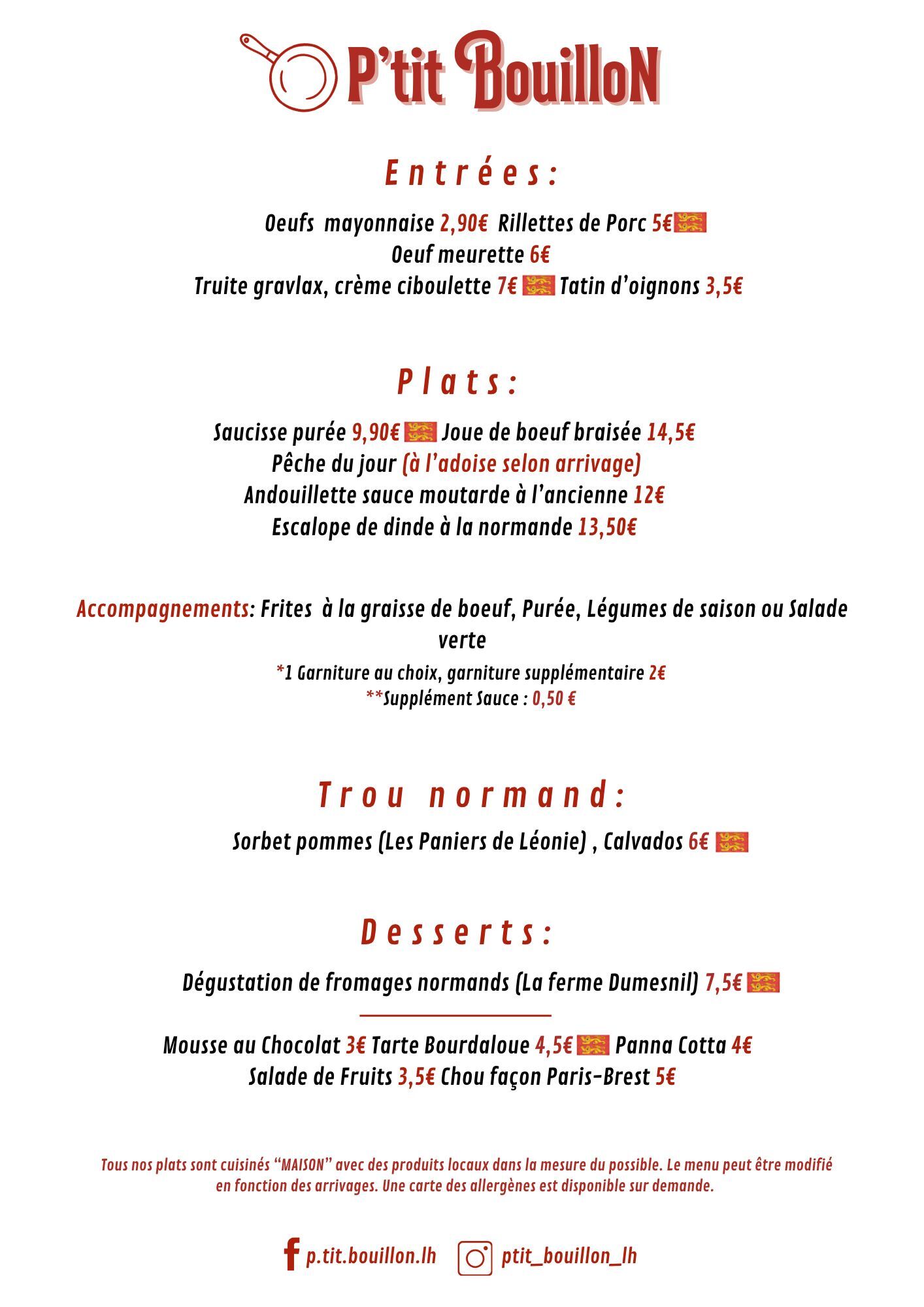En choisissant O P'tit Bouillon pour votre repas, vous soutenez aussi tout un réseau de producteurs et artisans de la région. Nos pommes de terre viennent de Saint-Martin-du-Manoir, nos viandes d'éleveurs normands, et la plupart de nos fruits et légumes sont issus de cultures locales et responsables. Nous travaillons main dans la main avec des partenaires locaux, comme des mareyeurs, maraîchers et éleveurs passionnés, qui nous livrent chaque jour leurs meilleurs produits pour vous régaler. C'est ça aussi, l'esprit bistrot : une cuisine de qualité, simple et généreuse, qui met à l'honneur le travail des petits producteurs !